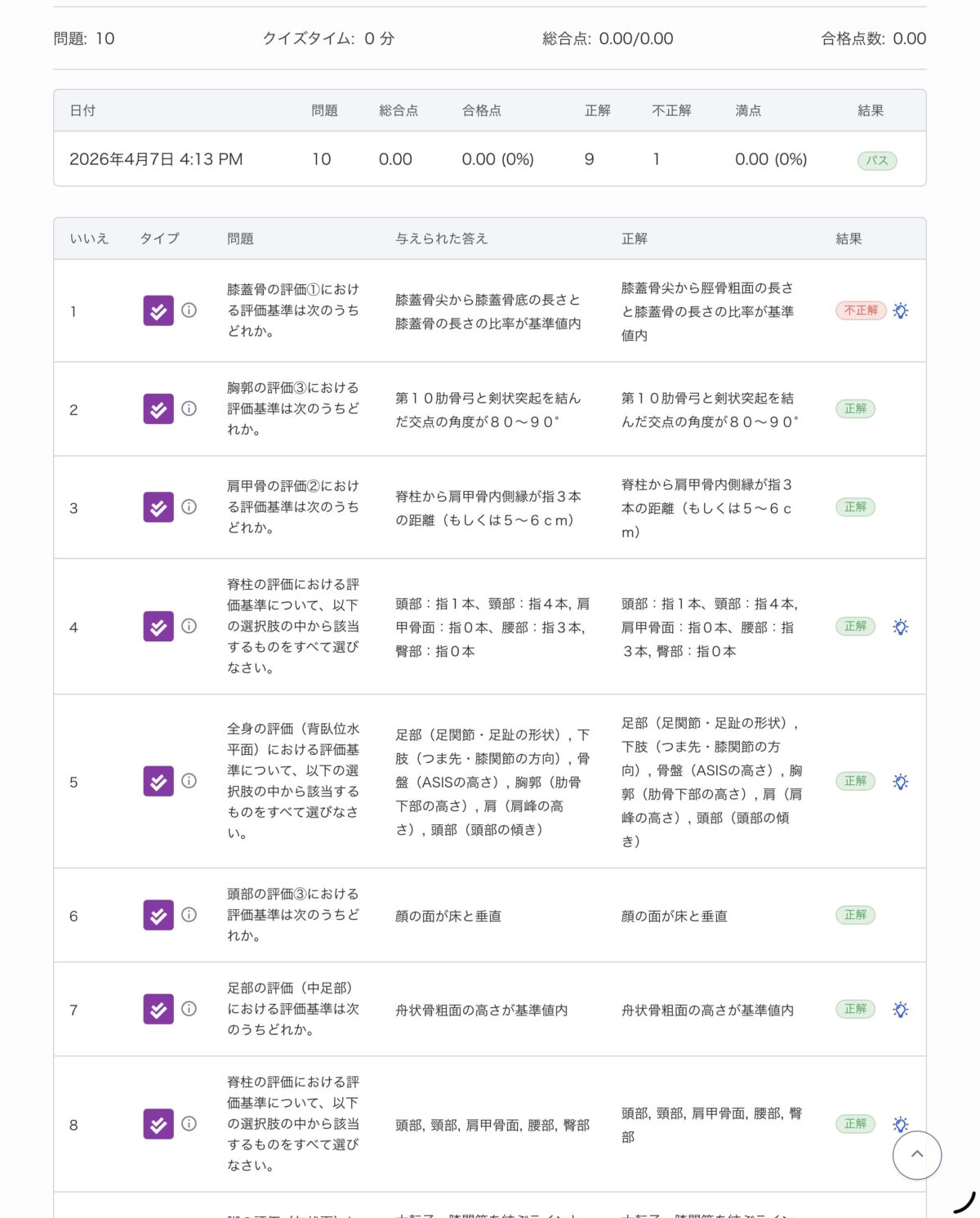 10問回答後、回答の正誤が表示されます。何度でも挑戦することができます。